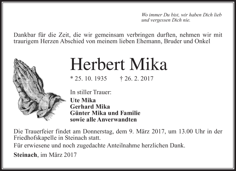 Hier finden Sie alle Traueranzeigen aus der Zeitung, die bisher für Herbert Mika erschienen sind. Weitere Traueranzeigen, die in der Zeitung erscheinen, werden hier ebenfalls aufgelistet