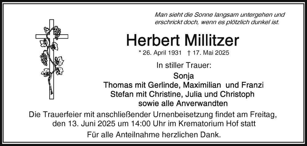 Hier finden Sie alle Traueranzeigen aus der Zeitung, die bisher für Herbert Millitzer erschienen sind. Weitere Traueranzeigen, die in der Zeitung erscheinen, werden hier ebenfalls aufgelistet