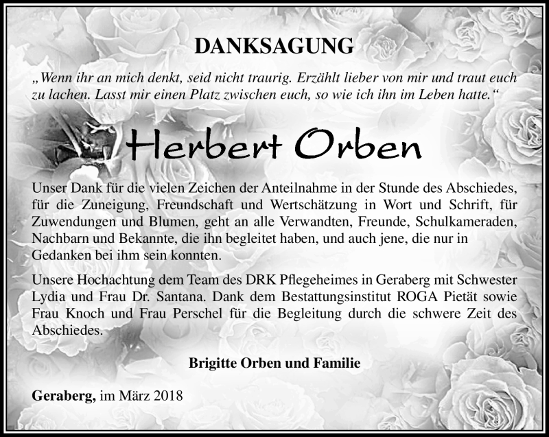 Hier finden Sie alle Traueranzeigen aus der Zeitung, die bisher für Herbert Orben erschienen sind. Weitere Traueranzeigen, die in der Zeitung erscheinen, werden hier ebenfalls aufgelistet