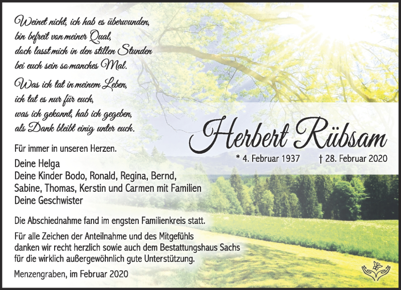 Hier finden Sie alle Traueranzeigen aus der Zeitung, die bisher für Herbert Rübsam erschienen sind. Weitere Traueranzeigen, die in der Zeitung erscheinen, werden hier ebenfalls aufgelistet