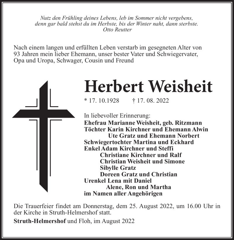 Hier finden Sie alle Traueranzeigen aus der Zeitung, die bisher für Herbert Weisheit erschienen sind. Weitere Traueranzeigen, die in der Zeitung erscheinen, werden hier ebenfalls aufgelistet