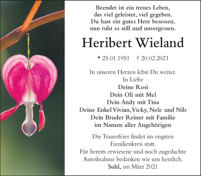 Hier finden Sie alle Traueranzeigen aus der Zeitung, die bisher für Heribert Wieland erschienen sind. Weitere Traueranzeigen, die in der Zeitung erscheinen, werden hier ebenfalls aufgelistet