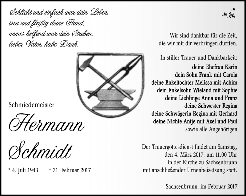 Hier finden Sie alle Traueranzeigen aus der Zeitung, die bisher für Hermann Schmidt erschienen sind. Weitere Traueranzeigen, die in der Zeitung erscheinen, werden hier ebenfalls aufgelistet