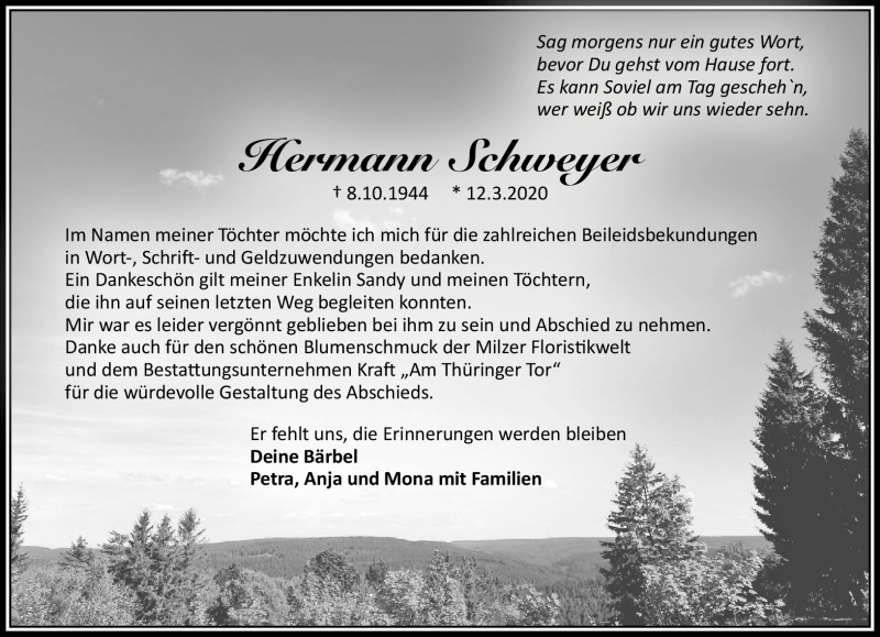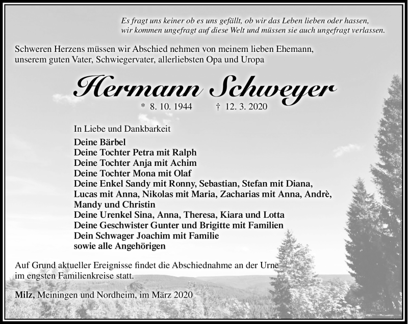 Hier finden Sie alle Traueranzeigen aus der Zeitung, die bisher für Hermann Schweyer erschienen sind. Weitere Traueranzeigen, die in der Zeitung erscheinen, werden hier ebenfalls aufgelistet