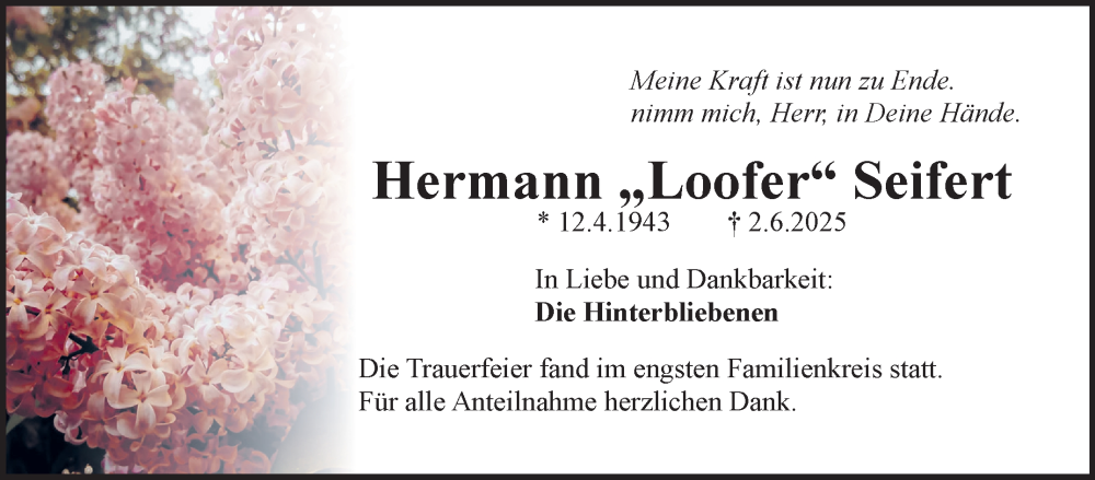 Hier finden Sie alle Traueranzeigen aus der Zeitung, die bisher für Hermann Seifert erschienen sind. Weitere Traueranzeigen, die in der Zeitung erscheinen, werden hier ebenfalls aufgelistet