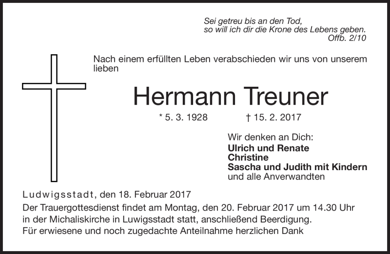 Hier finden Sie alle Traueranzeigen aus der Zeitung, die bisher für Hermann Treuner erschienen sind. Weitere Traueranzeigen, die in der Zeitung erscheinen, werden hier ebenfalls aufgelistet
