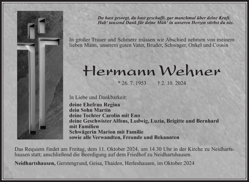 Hier finden Sie alle Traueranzeigen aus der Zeitung, die bisher für Hermann Wehner erschienen sind. Weitere Traueranzeigen, die in der Zeitung erscheinen, werden hier ebenfalls aufgelistet