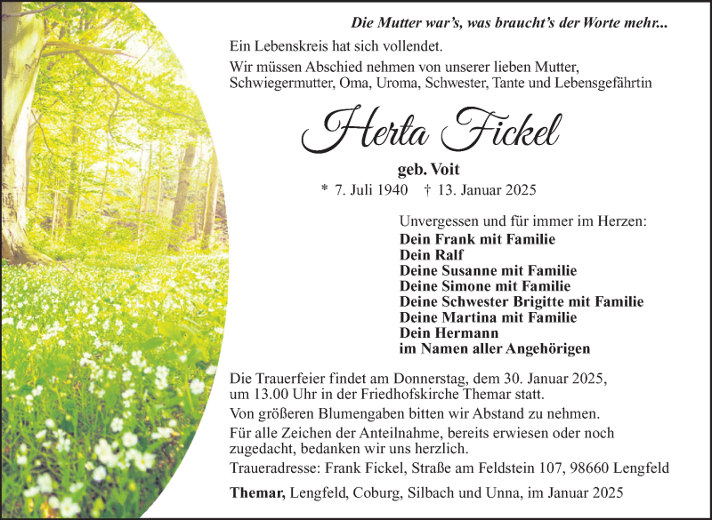 Hier finden Sie alle Traueranzeigen aus der Zeitung, die bisher für Herta Fickel erschienen sind. Weitere Traueranzeigen, die in der Zeitung erscheinen, werden hier ebenfalls aufgelistet