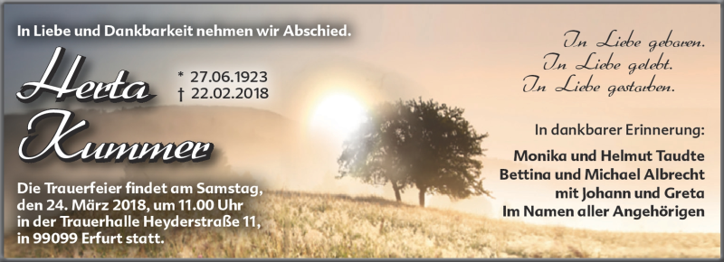 Hier finden Sie alle Traueranzeigen aus der Zeitung, die bisher für Herta Kummer erschienen sind. Weitere Traueranzeigen, die in der Zeitung erscheinen, werden hier ebenfalls aufgelistet