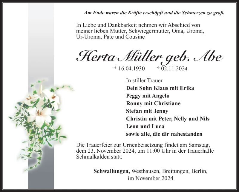 Hier finden Sie alle Traueranzeigen aus der Zeitung, die bisher für Herta Müller erschienen sind. Weitere Traueranzeigen, die in der Zeitung erscheinen, werden hier ebenfalls aufgelistet