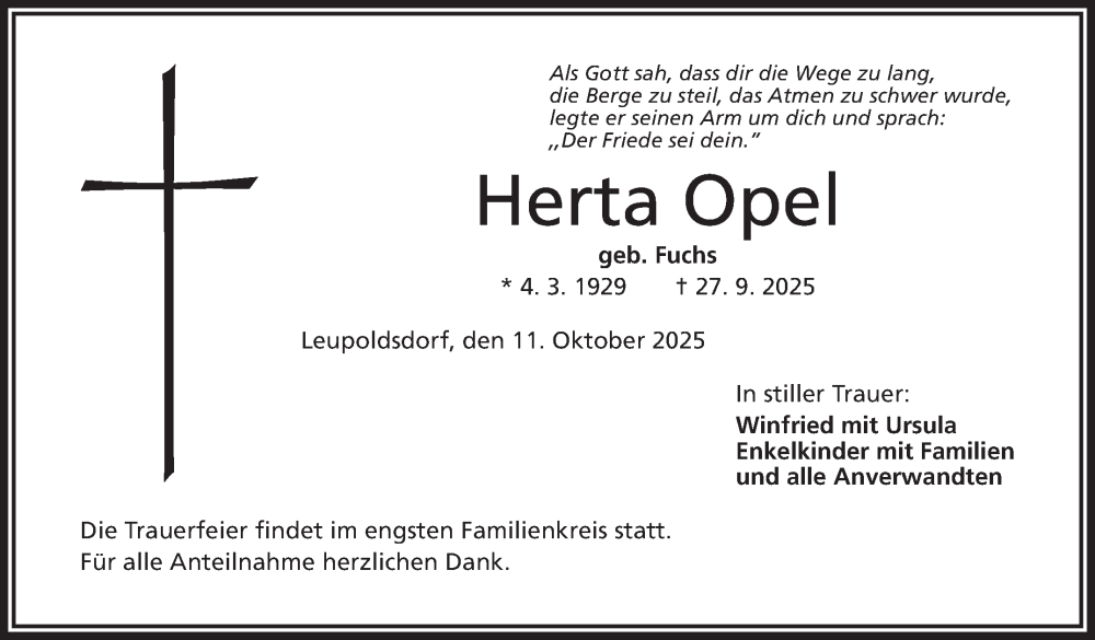 Hier finden Sie alle Traueranzeigen aus der Zeitung, die bisher für Herta Opel erschienen sind. Weitere Traueranzeigen, die in der Zeitung erscheinen, werden hier ebenfalls aufgelistet