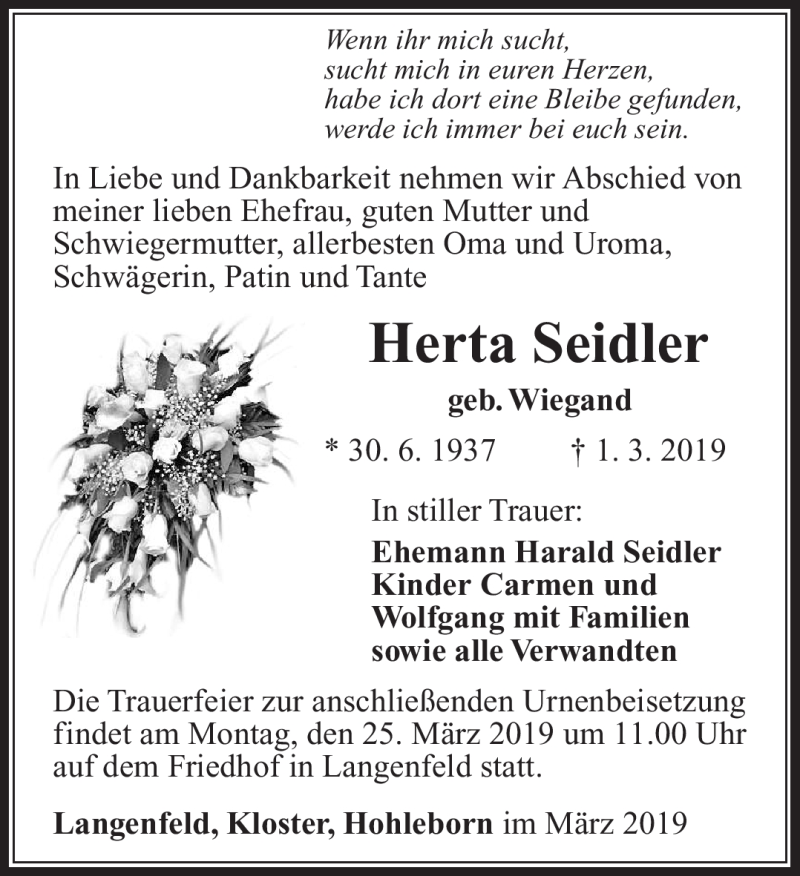 Hier finden Sie alle Traueranzeigen aus der Zeitung, die bisher für Herta Seidler erschienen sind. Weitere Traueranzeigen, die in der Zeitung erscheinen, werden hier ebenfalls aufgelistet