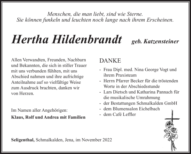 Hier finden Sie alle Traueranzeigen aus der Zeitung, die bisher für Hertha Hildenbrand erschienen sind. Weitere Traueranzeigen, die in der Zeitung erscheinen, werden hier ebenfalls aufgelistet