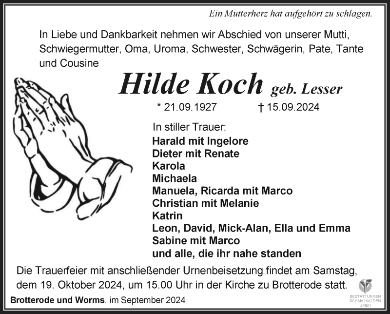 Hier finden Sie alle Traueranzeigen aus der Zeitung, die bisher für Hilde Koch erschienen sind. Weitere Traueranzeigen, die in der Zeitung erscheinen, werden hier ebenfalls aufgelistet