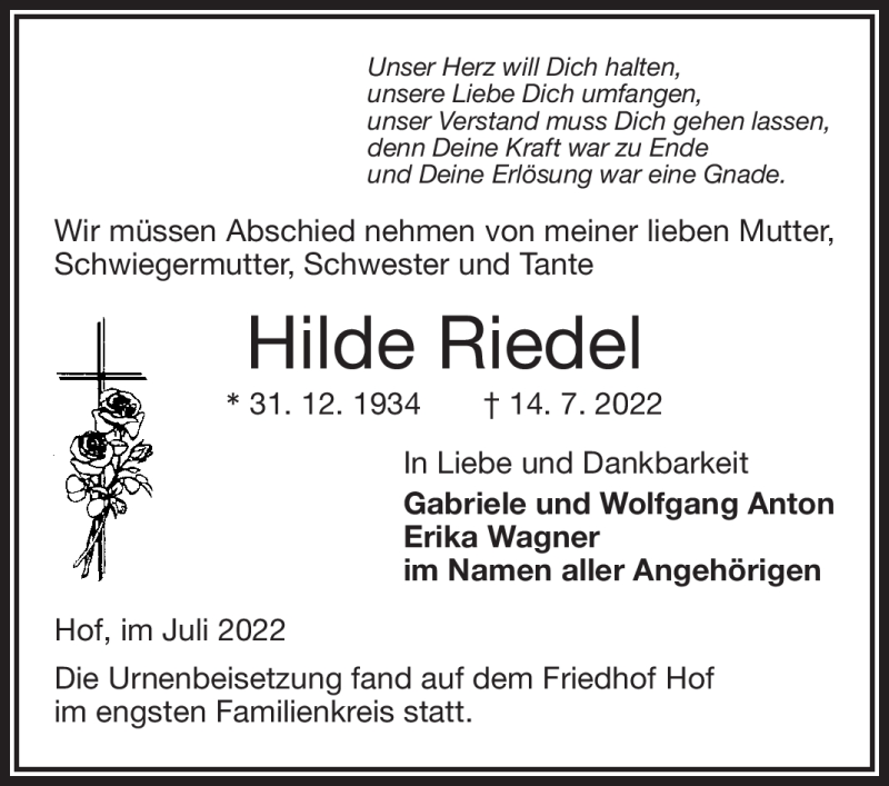 Hier finden Sie alle Traueranzeigen aus der Zeitung, die bisher für Hilde Riedel erschienen sind. Weitere Traueranzeigen, die in der Zeitung erscheinen, werden hier ebenfalls aufgelistet