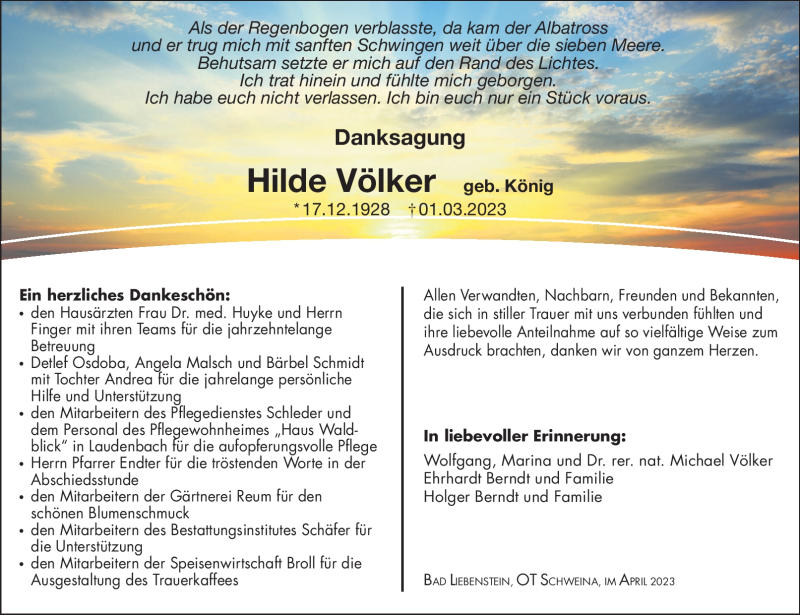 Hier finden Sie alle Traueranzeigen aus der Zeitung, die bisher für Hilde Völker erschienen sind. Weitere Traueranzeigen, die in der Zeitung erscheinen, werden hier ebenfalls aufgelistet