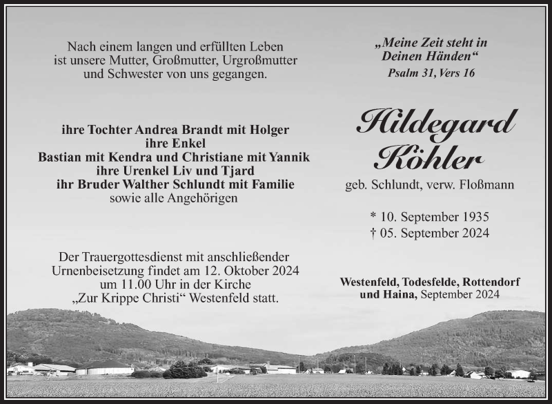 Hier finden Sie alle Traueranzeigen aus der Zeitung, die bisher für Hildegard Köhler erschienen sind. Weitere Traueranzeigen, die in der Zeitung erscheinen, werden hier ebenfalls aufgelistet