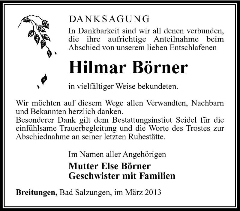 Hier finden Sie alle Traueranzeigen aus der Zeitung, die bisher für Hilmar Börner erschienen sind. Weitere Traueranzeigen, die in der Zeitung erscheinen, werden hier ebenfalls aufgelistet