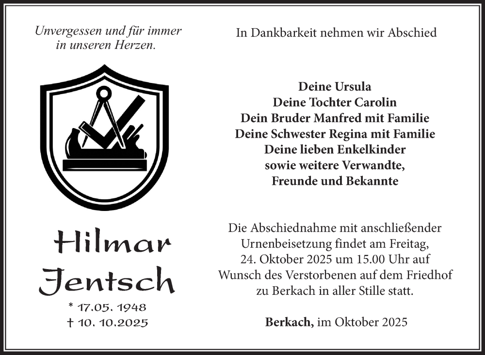 Hier finden Sie alle Traueranzeigen aus der Zeitung, die bisher für Hilmar Jentsch erschienen sind. Weitere Traueranzeigen, die in der Zeitung erscheinen, werden hier ebenfalls aufgelistet