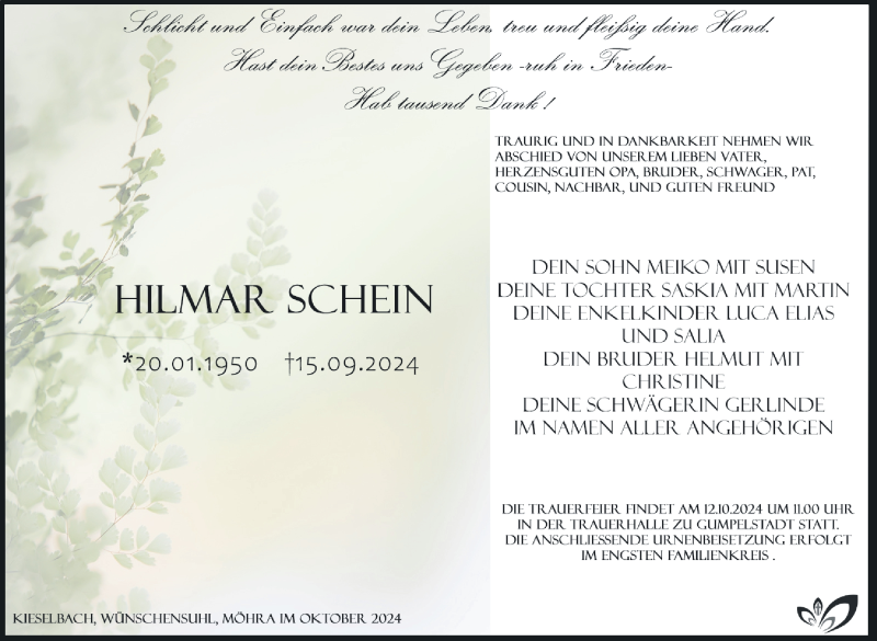 Hier finden Sie alle Traueranzeigen aus der Zeitung, die bisher für Hilmar Schein erschienen sind. Weitere Traueranzeigen, die in der Zeitung erscheinen, werden hier ebenfalls aufgelistet