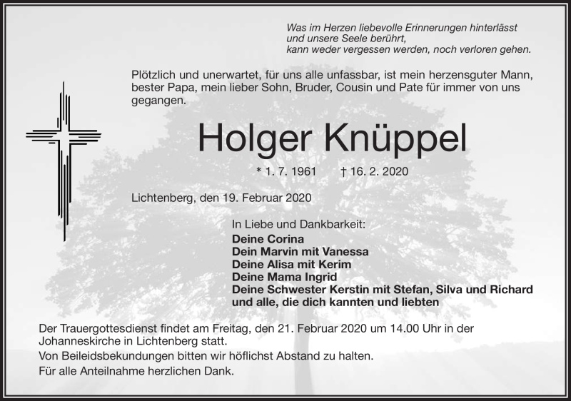 Hier finden Sie alle Traueranzeigen aus der Zeitung, die bisher für Holger Knüppel erschienen sind. Weitere Traueranzeigen, die in der Zeitung erscheinen, werden hier ebenfalls aufgelistet