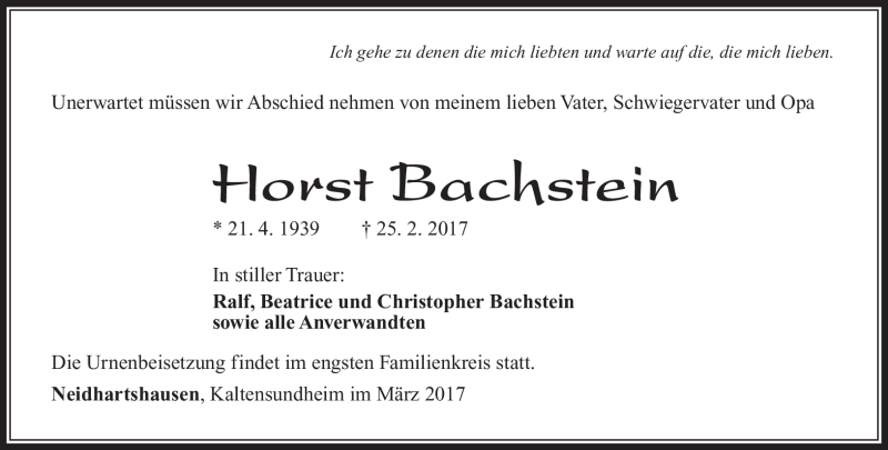 Hier finden Sie alle Traueranzeigen aus der Zeitung, die bisher für Horst Bachstein erschienen sind. Weitere Traueranzeigen, die in der Zeitung erscheinen, werden hier ebenfalls aufgelistet