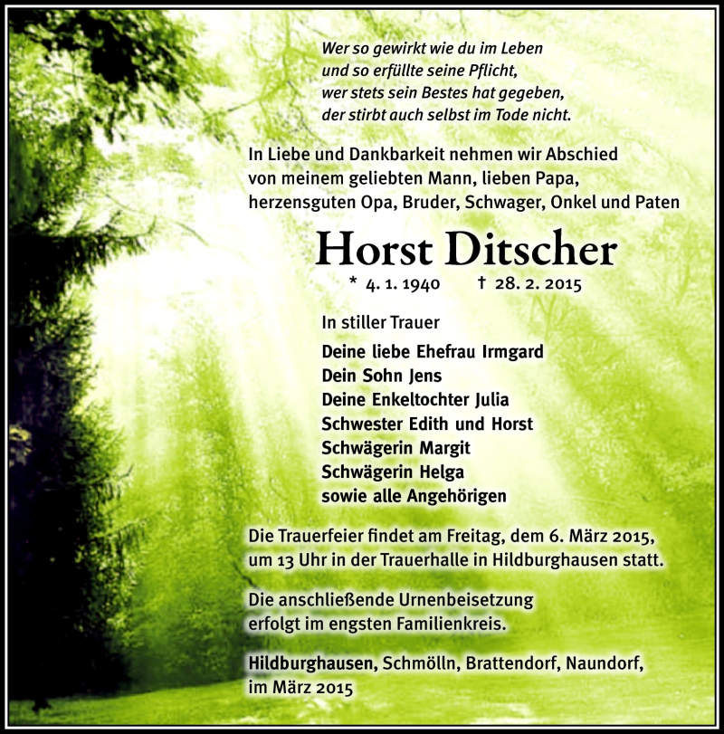 Hier finden Sie alle Traueranzeigen aus der Zeitung, die bisher für Horst Ditscher erschienen sind. Weitere Traueranzeigen, die in der Zeitung erscheinen, werden hier ebenfalls aufgelistet