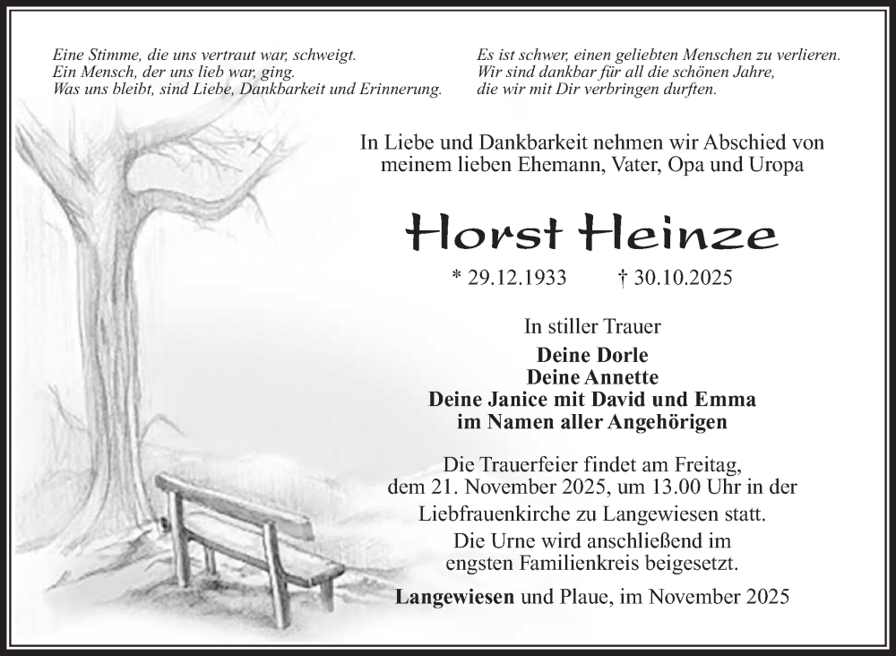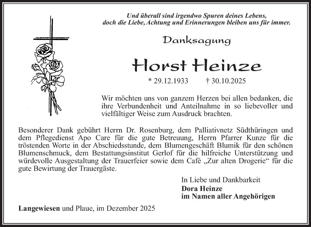 Hier finden Sie alle Traueranzeigen aus der Zeitung, die bisher für Horst Heinze erschienen sind. Weitere Traueranzeigen, die in der Zeitung erscheinen, werden hier ebenfalls aufgelistet
