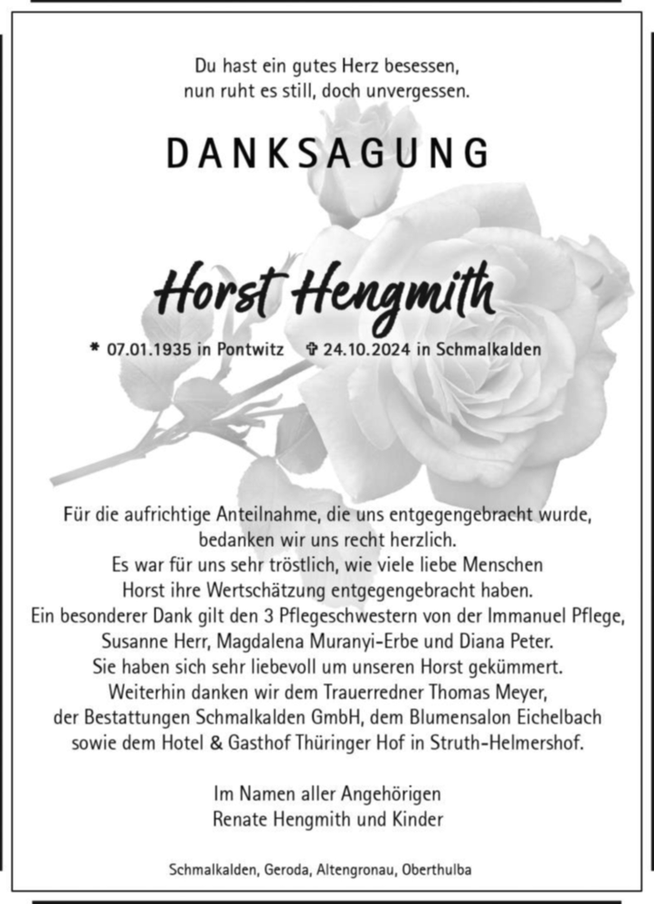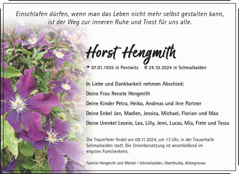 Hier finden Sie alle Traueranzeigen aus der Zeitung, die bisher für Horst Hengmith erschienen sind. Weitere Traueranzeigen, die in der Zeitung erscheinen, werden hier ebenfalls aufgelistet