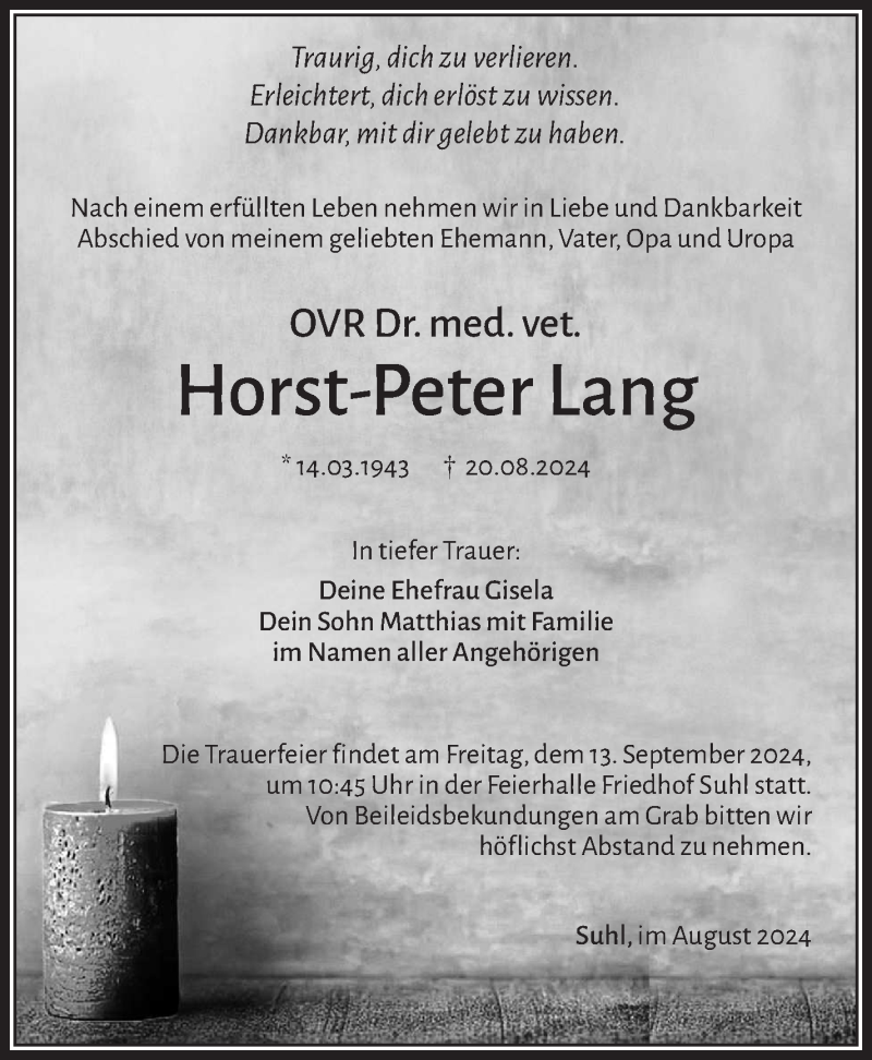 Hier finden Sie alle Traueranzeigen aus der Zeitung, die bisher für Horst-Peter Lang erschienen sind. Weitere Traueranzeigen, die in der Zeitung erscheinen, werden hier ebenfalls aufgelistet