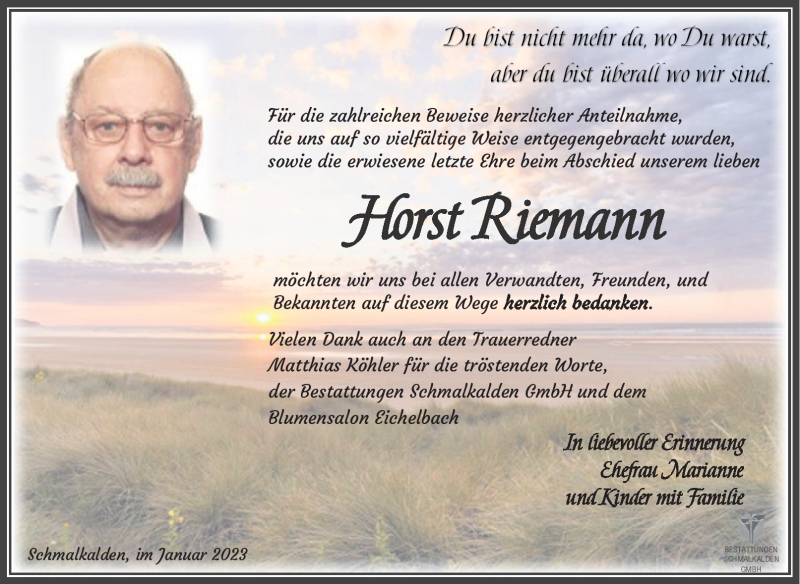 Hier finden Sie alle Traueranzeigen aus der Zeitung, die bisher für Horst Riemann erschienen sind. Weitere Traueranzeigen, die in der Zeitung erscheinen, werden hier ebenfalls aufgelistet