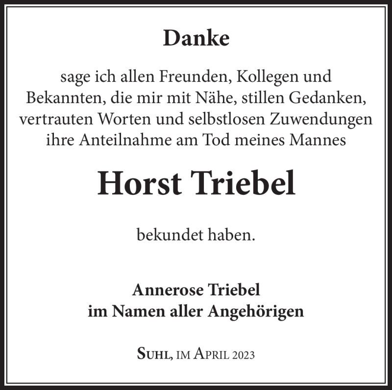Hier finden Sie alle Traueranzeigen aus der Zeitung, die bisher für Horst Triebel erschienen sind. Weitere Traueranzeigen, die in der Zeitung erscheinen, werden hier ebenfalls aufgelistet