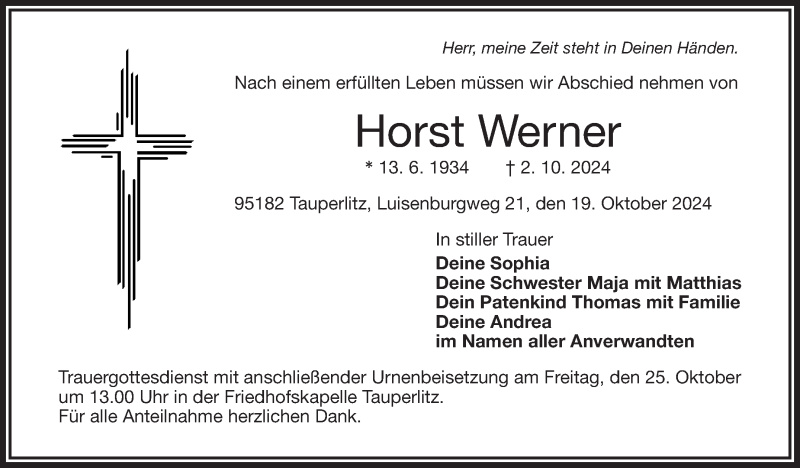Hier finden Sie alle Traueranzeigen aus der Zeitung, die bisher für Horst Werner erschienen sind. Weitere Traueranzeigen, die in der Zeitung erscheinen, werden hier ebenfalls aufgelistet