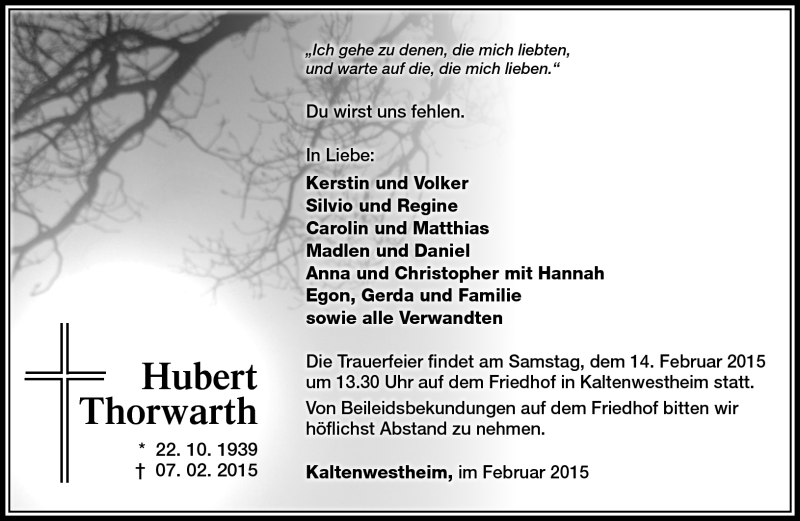 Hier finden Sie alle Traueranzeigen aus der Zeitung, die bisher für Hubert Thorwarth erschienen sind. Weitere Traueranzeigen, die in der Zeitung erscheinen, werden hier ebenfalls aufgelistet
