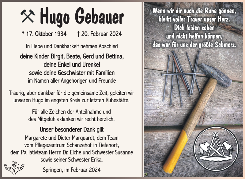 Hier finden Sie alle Traueranzeigen aus der Zeitung, die bisher für Hugo Gebauer erschienen sind. Weitere Traueranzeigen, die in der Zeitung erscheinen, werden hier ebenfalls aufgelistet