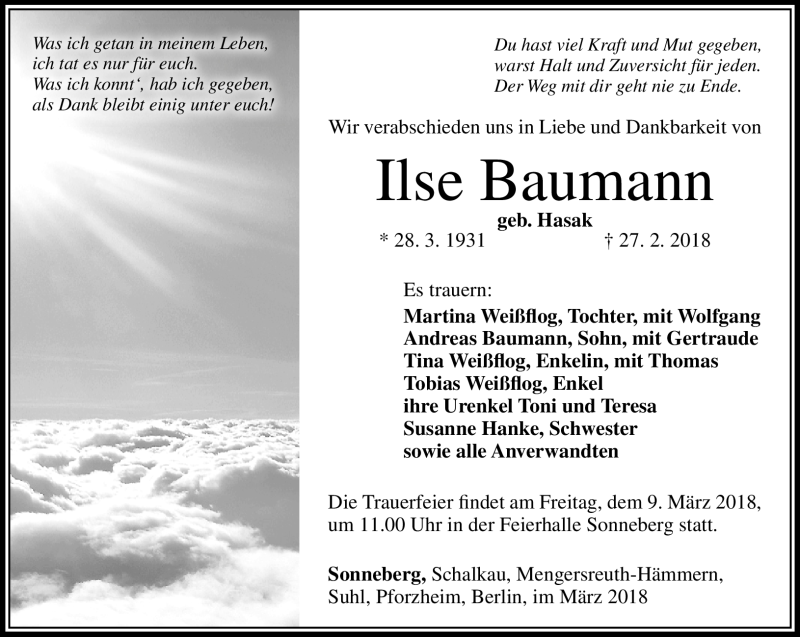 Hier finden Sie alle Traueranzeigen aus der Zeitung, die bisher für Ilse Baumann erschienen sind. Weitere Traueranzeigen, die in der Zeitung erscheinen, werden hier ebenfalls aufgelistet