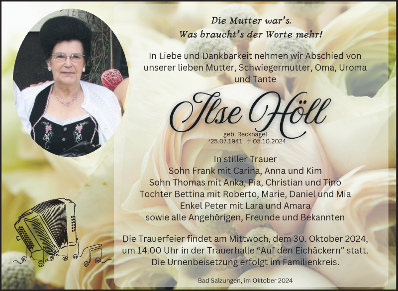 Hier finden Sie alle Traueranzeigen aus der Zeitung, die bisher für Ilse Höll erschienen sind. Weitere Traueranzeigen, die in der Zeitung erscheinen, werden hier ebenfalls aufgelistet