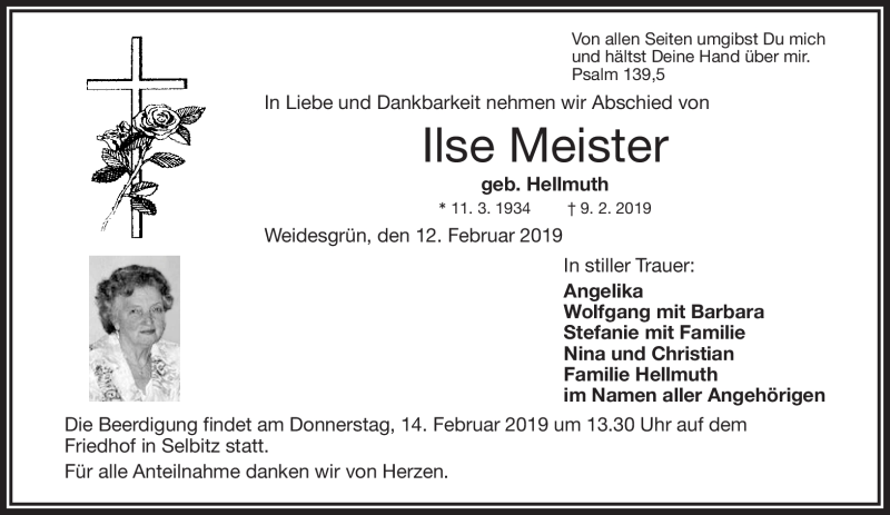 Hier finden Sie alle Traueranzeigen aus der Zeitung, die bisher für Ilse Meister erschienen sind. Weitere Traueranzeigen, die in der Zeitung erscheinen, werden hier ebenfalls aufgelistet