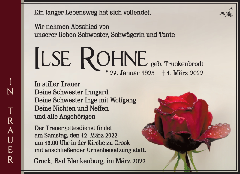 Hier finden Sie alle Traueranzeigen aus der Zeitung, die bisher für Ilse Rohne erschienen sind. Weitere Traueranzeigen, die in der Zeitung erscheinen, werden hier ebenfalls aufgelistet