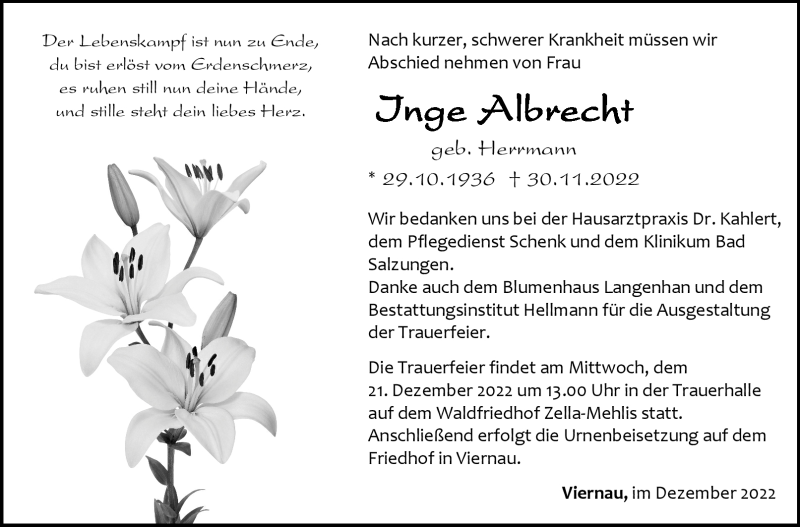 Hier finden Sie alle Traueranzeigen aus der Zeitung, die bisher für Inge Albrecht erschienen sind. Weitere Traueranzeigen, die in der Zeitung erscheinen, werden hier ebenfalls aufgelistet