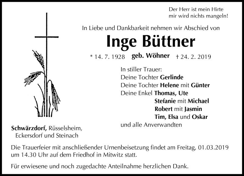 Hier finden Sie alle Traueranzeigen aus der Zeitung, die bisher für Inge Büttner erschienen sind. Weitere Traueranzeigen, die in der Zeitung erscheinen, werden hier ebenfalls aufgelistet