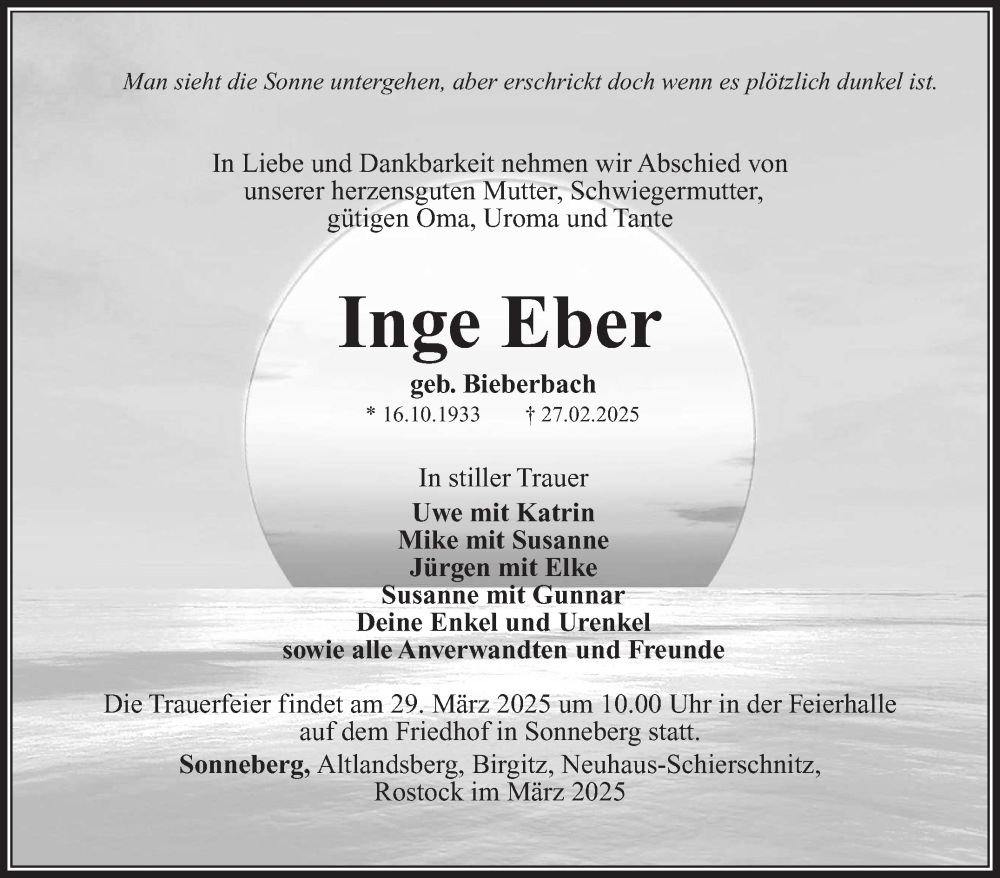 Hier finden Sie alle Traueranzeigen aus der Zeitung, die bisher für Inge Ebert erschienen sind. Weitere Traueranzeigen, die in der Zeitung erscheinen, werden hier ebenfalls aufgelistet