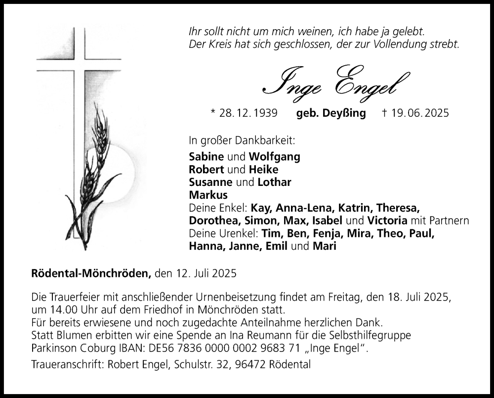 Hier finden Sie alle Traueranzeigen aus der Zeitung, die bisher für Inge Engel erschienen sind. Weitere Traueranzeigen, die in der Zeitung erscheinen, werden hier ebenfalls aufgelistet
