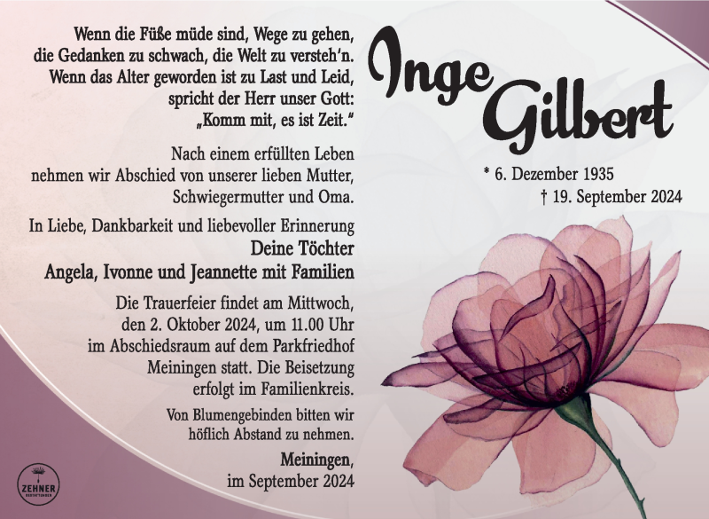 Hier finden Sie alle Traueranzeigen aus der Zeitung, die bisher für Inge Gilbert erschienen sind. Weitere Traueranzeigen, die in der Zeitung erscheinen, werden hier ebenfalls aufgelistet