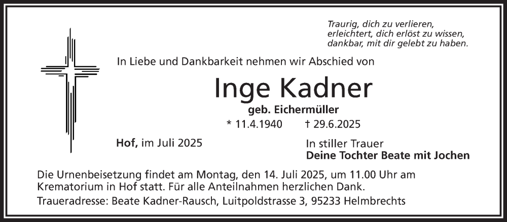 Hier finden Sie alle Traueranzeigen aus der Zeitung, die bisher für Inge Kadner erschienen sind. Weitere Traueranzeigen, die in der Zeitung erscheinen, werden hier ebenfalls aufgelistet