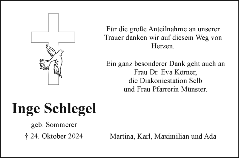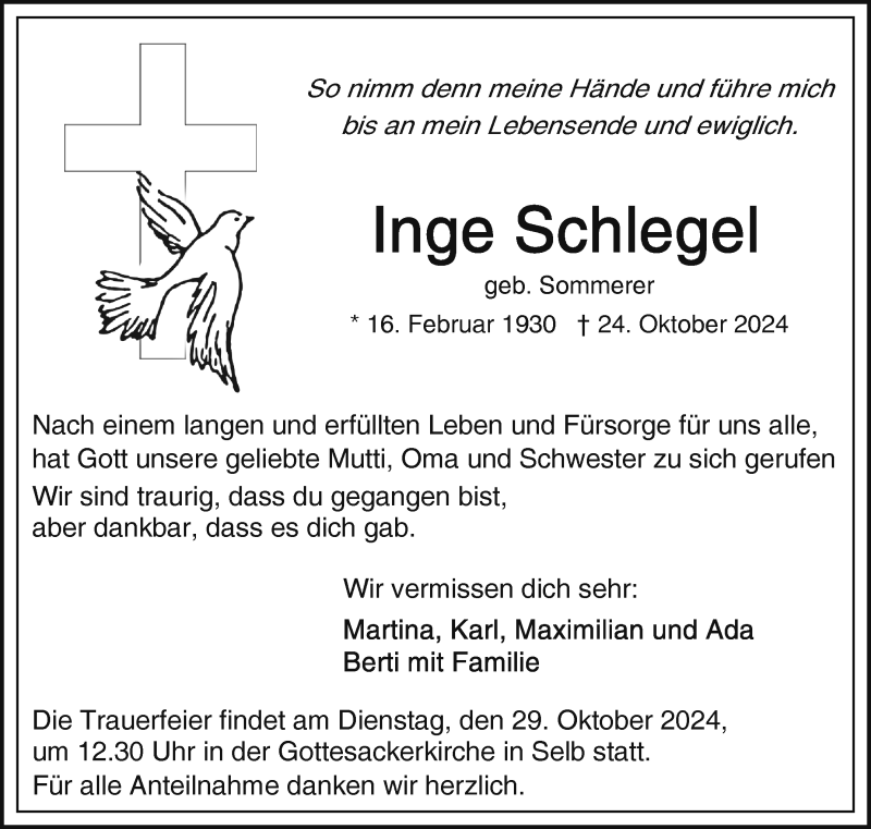 Hier finden Sie alle Traueranzeigen aus der Zeitung, die bisher für Inge Schlegel erschienen sind. Weitere Traueranzeigen, die in der Zeitung erscheinen, werden hier ebenfalls aufgelistet