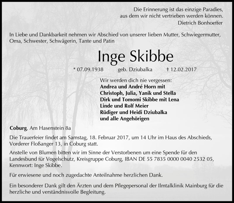 Hier finden Sie alle Traueranzeigen aus der Zeitung, die bisher für Inge Skibbe erschienen sind. Weitere Traueranzeigen, die in der Zeitung erscheinen, werden hier ebenfalls aufgelistet