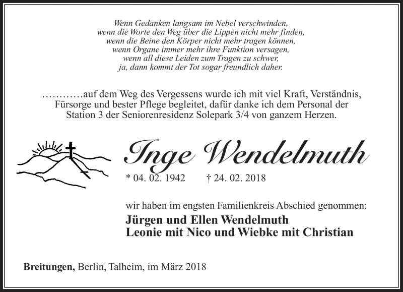 Hier finden Sie alle Traueranzeigen aus der Zeitung, die bisher für Inge Wendelmuth erschienen sind. Weitere Traueranzeigen, die in der Zeitung erscheinen, werden hier ebenfalls aufgelistet