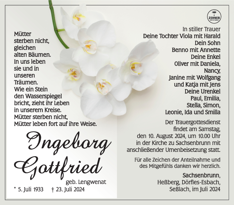 Hier finden Sie alle Traueranzeigen aus der Zeitung, die bisher für Ingeborg Gottfried erschienen sind. Weitere Traueranzeigen, die in der Zeitung erscheinen, werden hier ebenfalls aufgelistet