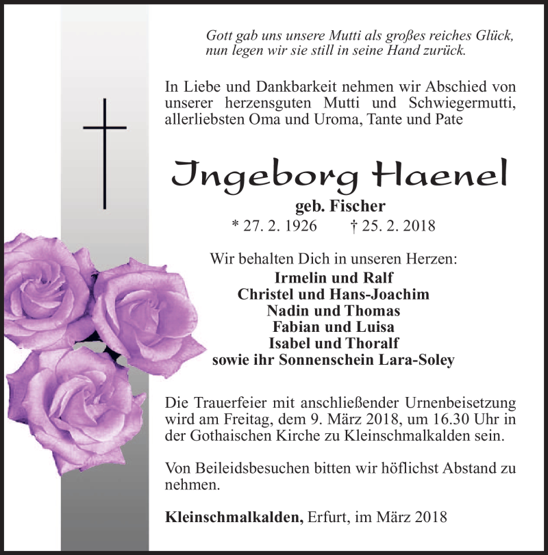Hier finden Sie alle Traueranzeigen aus der Zeitung, die bisher für Ingeborg Haenel erschienen sind. Weitere Traueranzeigen, die in der Zeitung erscheinen, werden hier ebenfalls aufgelistet